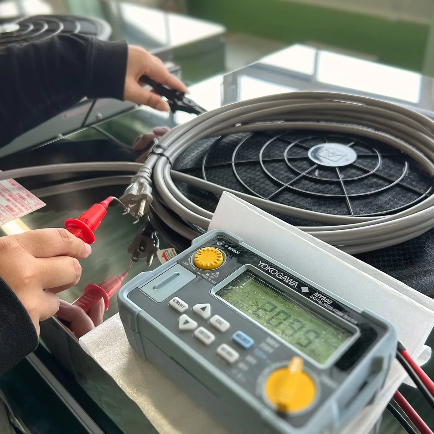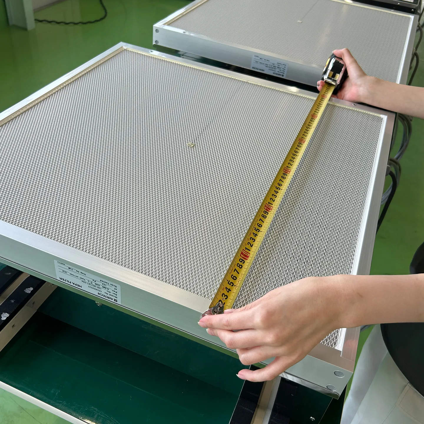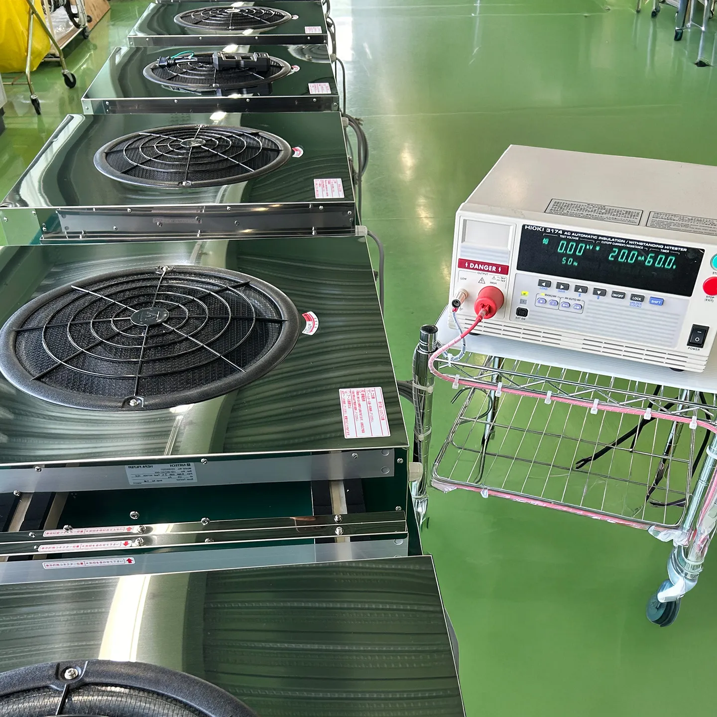 MACシリーズは、クリーン環境に不可欠なファンフィルターユニットとして、高い信頼性が求められる製品です。当社では、漏電や異常発熱といった重大なトラブルを未然に防ぐため、リーク検査・設備電力検査・絶縁抵抗検査を全数検査として実施しています。